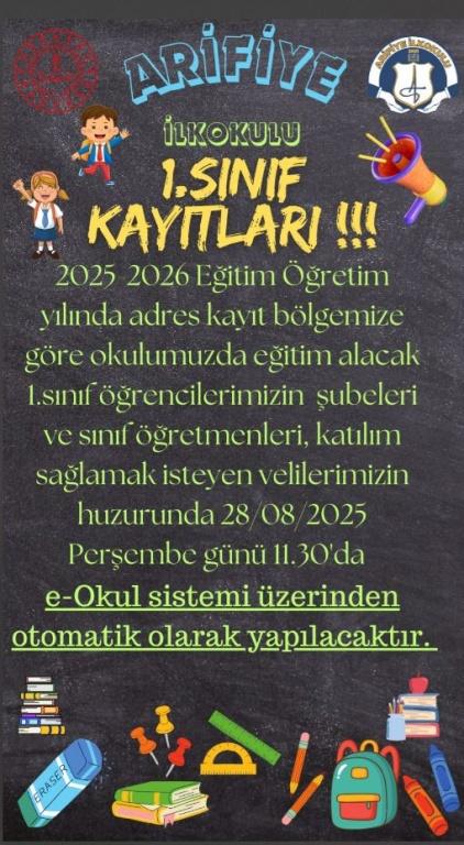 2025-2026 EĞİTİM ÖĞRETİM YILINDA ADRES KAYIT BÖLGEMİZE GÖRE OKULUMUZDA EĞİTİM ALACAK 1. SINIF ÖĞRENCİLERİMİZİN ŞUBELERİ VE SINIF ÖĞRETMENLERİ, KATILIM SAĞLAMAK İSTEYEN VELİLERİMİZİN HUZURUNDA 28/08/2025 PERŞEMBE GÜNÜ SAAT 11:30'DA E-OKUL SİSTEMİ ÜZERİNDEN OTOMATİK OLARAK YAPILACAKTIR.