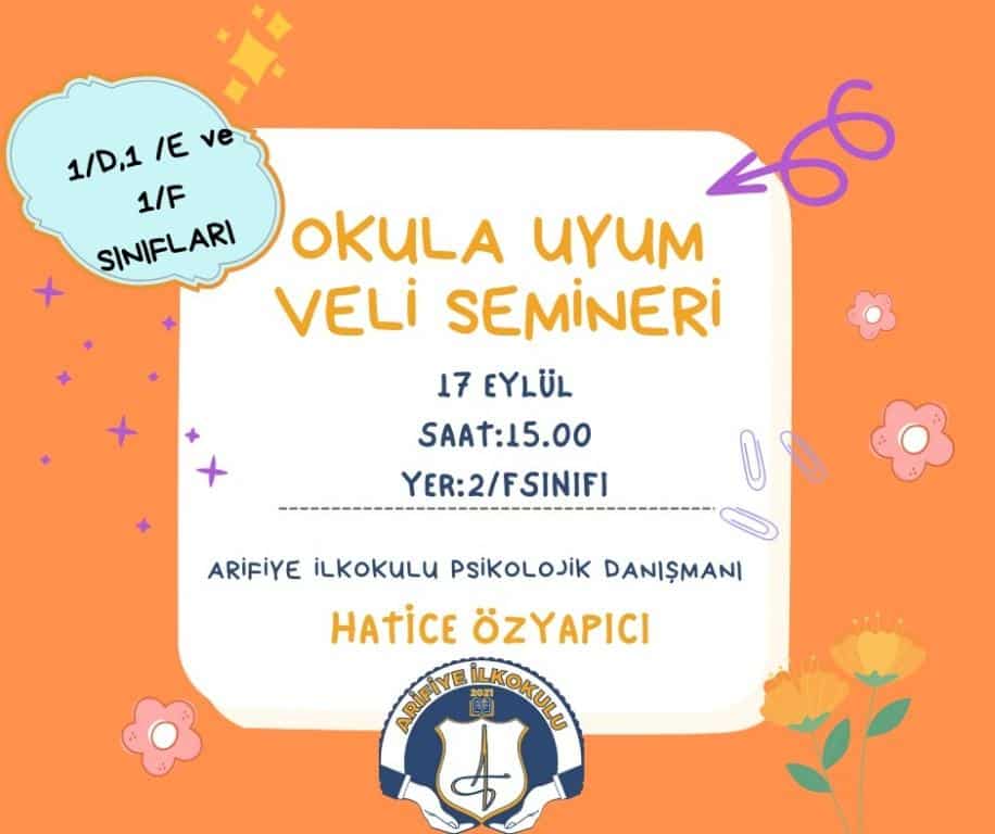 OKUL REHBER ÖĞRETMENİMİZ HATİCE ÖZYAPICI'NIN DÜZENLEDİĞİ 1. SINIF OKULA UYUM VELİ SEMİNERİNE TÜM 1. SINIF VELİLERİMİZİ BEKLERİZ.